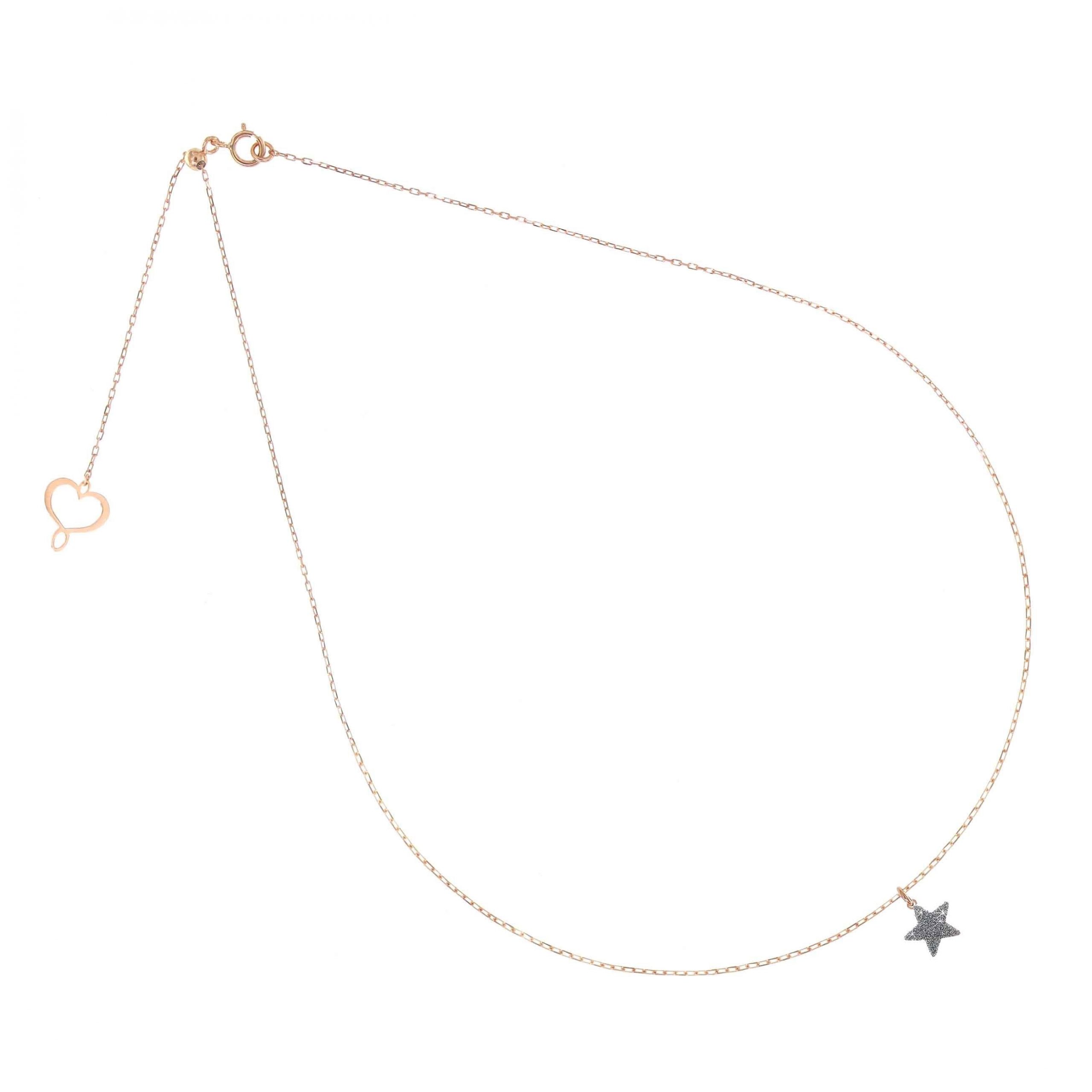 Girocollo Aurum realizzato in oro rosa 18 carati con stella pendente centrale in lastra con polvere di diamanti cromo. Il cuore misura 7 mm x 8 mm. La circonferenza può essere regolata grazie alla sfera scorrevole fino ad un massimo di 41 cm. Chiusura con anello a molla.