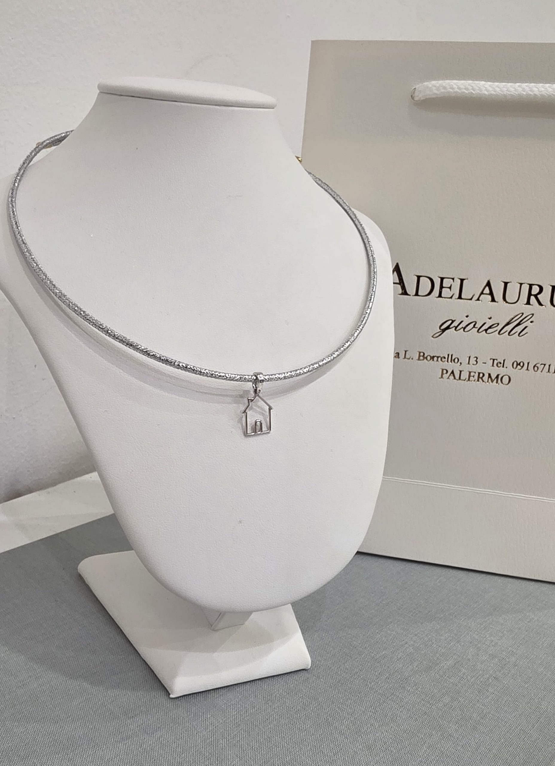 Collana cordoncino regolabile con pendente casetta in oro bianco 18kt